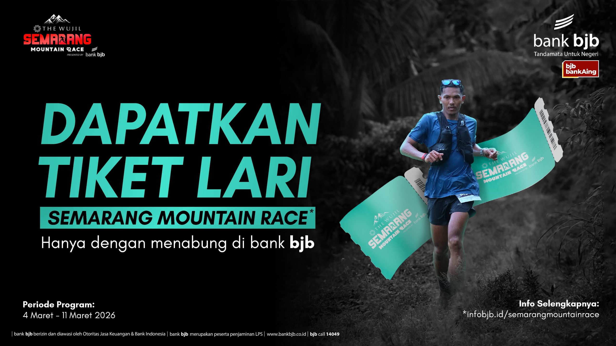 Sebagai bentuk dukungan terhadap ajang tersebut, bank bjbmenghadirkan program promo Semarang Mountain Race berupa pemberian tiket lari kepada nasabah maupun calon nasabah yang mengikuti skema penempatan dana sesuai ketentuan. Program ini berlangsung pada periode 4–11 Maret 2026 selama kuota masih tersedia, dengan total kuota sebanyak 50 tiket lari.